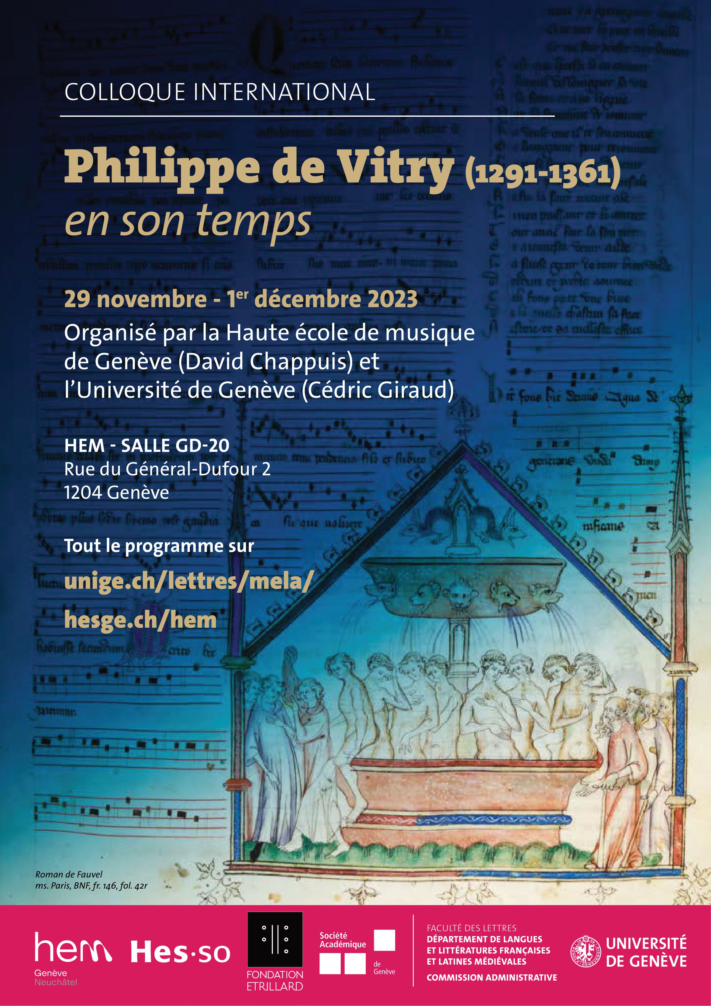 Réunir des spécialistes de ces diverses disciplines ne sera pas de trop pour parvenir à cerner l´art et la science de Philippe de Vitry dans toute leur subtilité. En somme, le colloque, organisé conjointement par la Haute école de musique et l´Université de Genève, a pour ambition de situer Philippe de Vitry en son siècle et de mesurer l´influence qu´il a pu y exercer, en explorant la part de singularité et de représentativité qu´offre toute vie. Autrement dit, en quoi Philippe de Vitry est-il un homme de son temps et dans quelle mesure cette première moitié du XIVe siècle peut-elle être dite « l´âge de Philippe de Vitry » ? À cet effet, les intervenants sont invités à présenter la carrière et les réseaux de l´homme, à préciser son apport à l´Ars nova et à la poésie, à situer sa place par rapport aux grands courants intellectuels et artistiques de son temps, qu´il s´agisse des arts visuels, du nominalisme, de la théologie ou de la littérature.