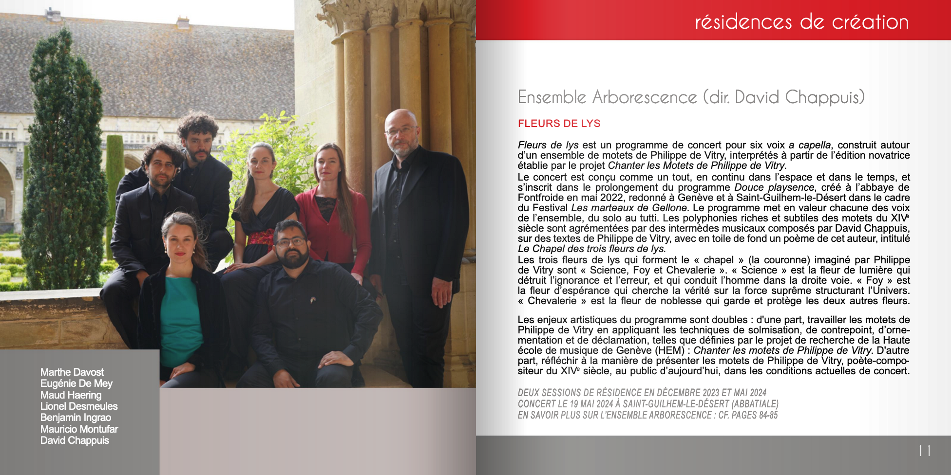 Le concert met en valeur chacune des voix de l’ensemble, du solo au tutti. Les polyphonies riches et subtiles des motets du XIVe siècle sont agrémentées par des intermèdes musicaux composés par David Chappuis, sur des textes de Philippe de Vitry, avec en toile de fond un poème de cet auteur, intitulé Le Chapel des trois fleurs de lys.