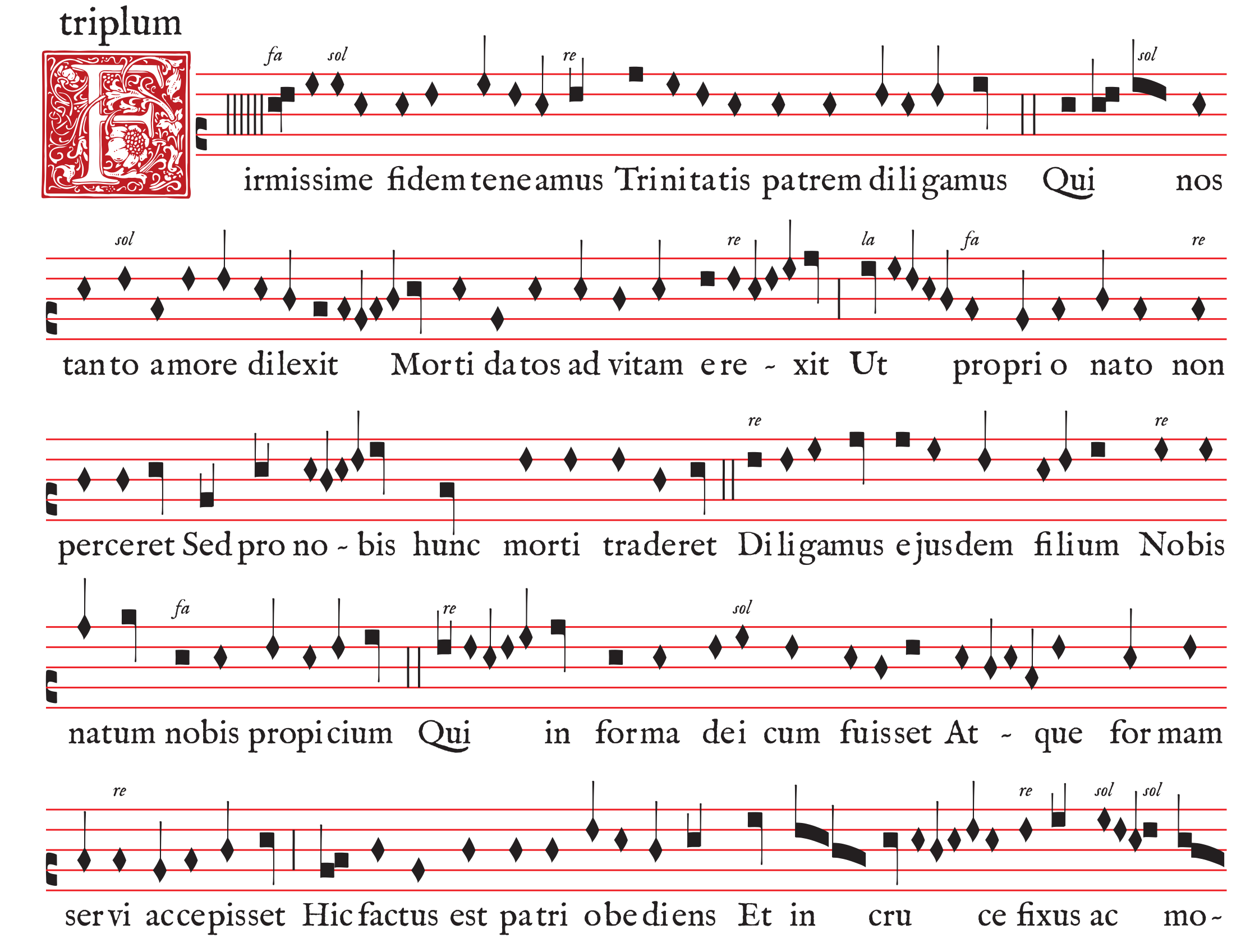 • Solmisation : comme on peut le voir, la partie de triplum ci-dessus ne comporte pas d’altérations éditoriales (dièses ou bémols), mais des indications de solmisation, dans le but de permettre une appréhension plus globale de la musica ficta. Amenés à mieux anticiper leur parcours dans ce système, les chanteurs acquièrent des réflexes mélodiques proches de ceux qu’inculquait l’éducation musicale au Moyen Âge.